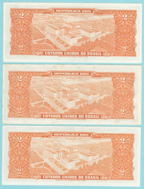 BRASIL - 1956 - C.063 - 2 CRUZEIROS - (P-157Ab) 3 Notes in Uncirculated condition. Price is for 3 notes.