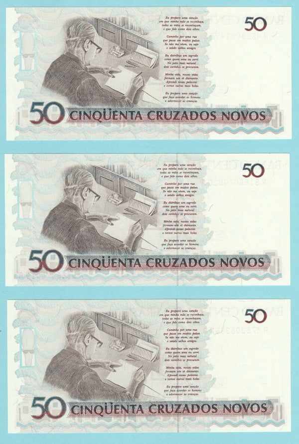 BRASIL - 1990 - C.210 - 50 CRUZEIROS / 50 CRUZADOS NOVOS - (P-223). 3 NoteS in Uncirculated condition. Price is for the 3 notes.